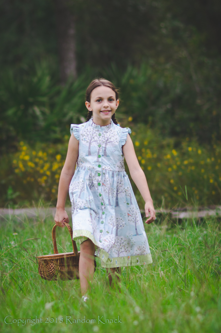 I've been sitting on this fabric for quite a few years. It's part of the Micheal Miller Windy Day collection, and I believe you can still get it from a couple online stores if you fall in love with it as much as I did (and not outrageously priced either). It may have originally been intended for a dress for her older sister, but I'm secretely glad I didn't make it before. This fabric is perfect for this dress, and this dress is perfect for this dress loving girl. She did a little jump when she first saw it, and was more than happy to go take pictures of it today.The name of the pattern insisted that there be a slight picnic theme of such to the pictures. I didn't go all out. But that basket? It was my grandma's sewing basket. It came full of all sorts of little treasures when she passed away a few years ago. She hand painted the flowers on it, and I treasure it. It belonged in these pictures.